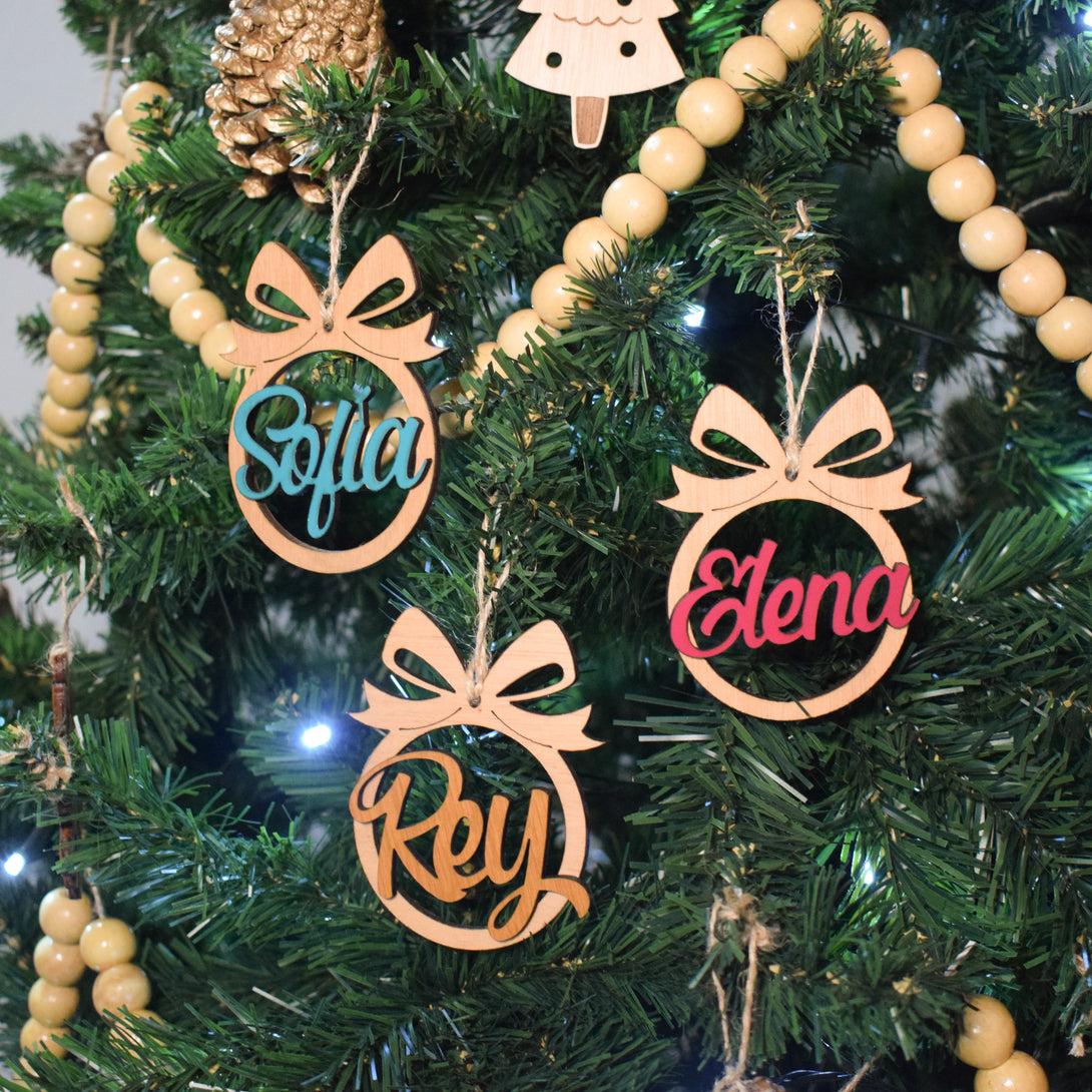 ¡Llena tu árbol de navidad con los nombres de las personas que más quieres! Adornos de 8cm de alto totalmente personalizado, hecho con madera natural sostenible certificada de 3 mm cortada y grabada con tecnología láser.
