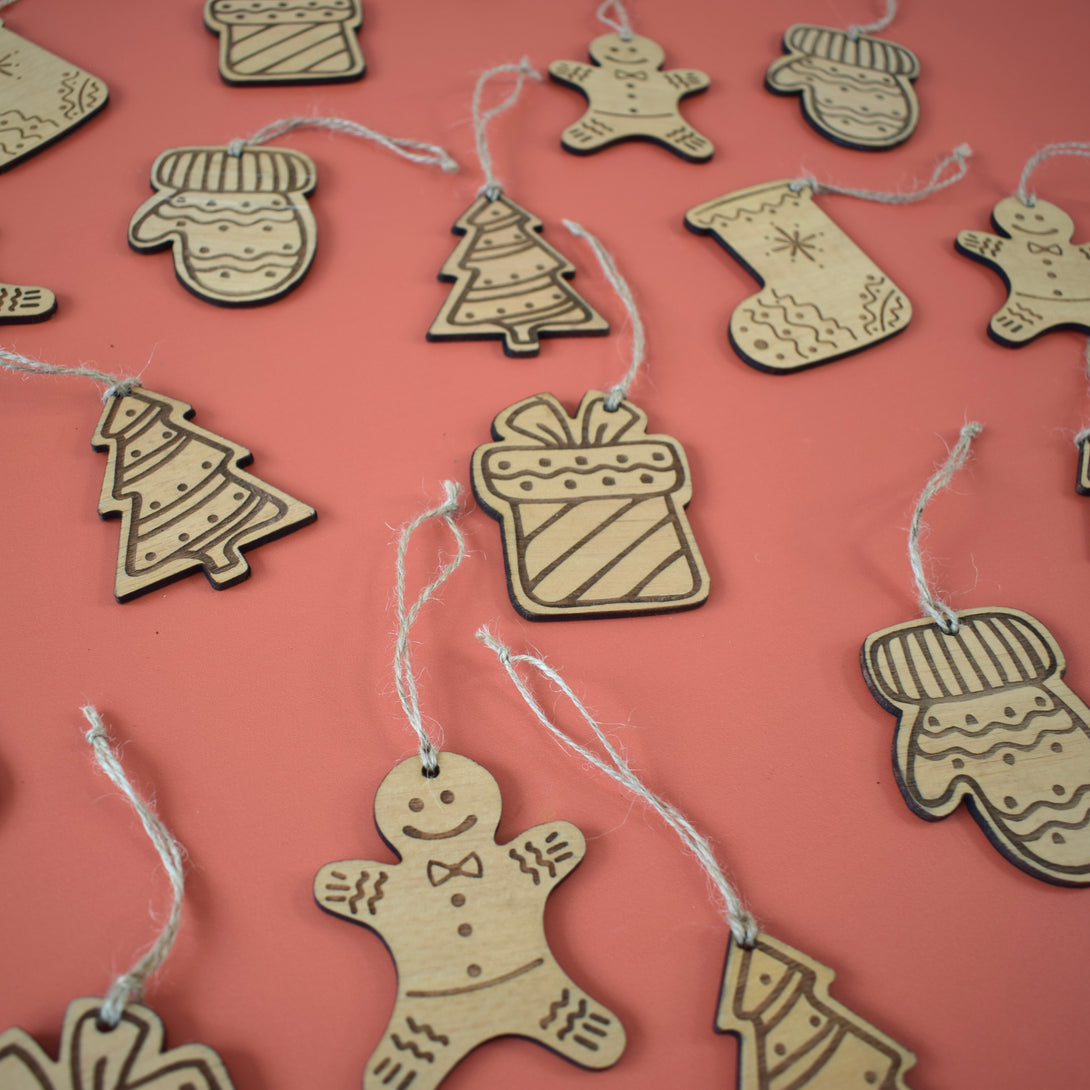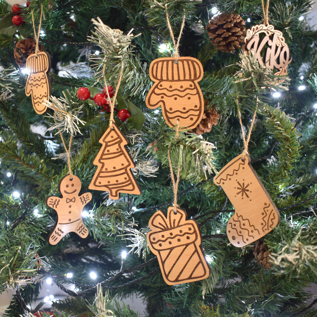 ¡No necesitas usar plástico para decorar tu árbol de navidad! Kit x5 adornos hechos con madera natural sostenible certificada de 3mm, incluye una unidad por diseño (árbol, galleta, regalo, bola navideña y copo de nieve).